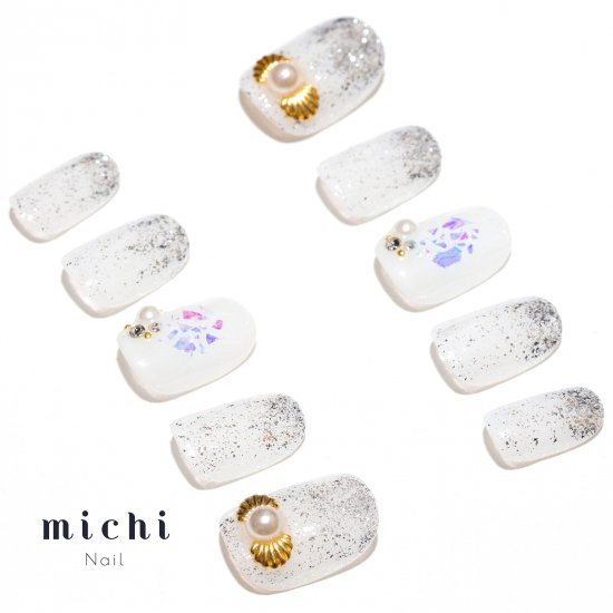 シェルリボンのオーロラホロネイル michinail ネイルチップ ミチネイル ネイル つけ爪 ハンドメイドネイル ショートネイル ニュアンスネイル ブライダルネイル 成人式ネイル