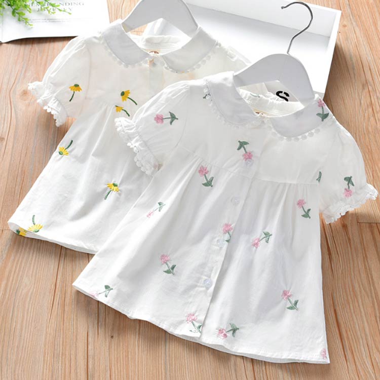 送料無料 新作 ブラウス キッズ シャツ 半袖 女の子 トップス 半袖シャツ 子供服 丸襟 刺繍 ガールズ かわいい コットン カジュアル おしゃれ 綿 春 夏 韓国