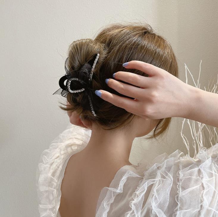 ラインストーンが輝くシフォンリボンのバンスクリップ(ブラック)ヘアピン/バレッタ/髪飾り/アクセサリー/女/花/ヘッドドレス/ヘアアクセサリー/フォーマル/結婚式/発表会/ピアノ/かわいい/おしゃれ/入園/入学式/卒園式/プレゼント
