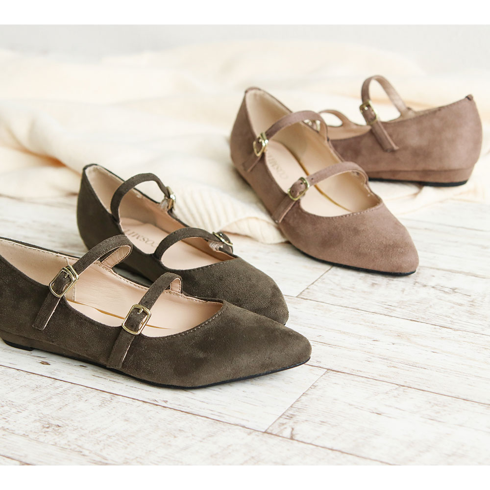 パンプス 痛くない 脱げない 歩きやすい ローヒール ぺたんこ ストラップ付き ポインテッドトゥ アーモンドトゥ ダブルストラップ 黒 スエード カーキ とんがり カッターシューズ メリージェーン 秋冬 靴下コーデ 靴 おしゃれ 1074