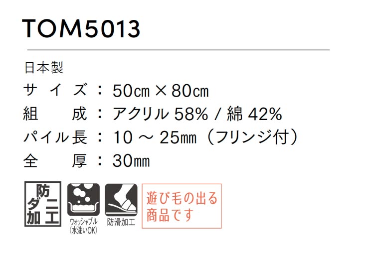【送料無料】 東リ マット 50×80 玄関マット 防ダニ ウォッシャブル 防滑加工 洗面台 室内用 マット 滑り止め付き ベージュ TOM5013 商品の詳しい情報ブランド名東リ / TOLI品種定型サイズマット / 玄関マット商品名TOM5013生産国日本サイズ50cm×80cm組成アクリル58%綿42%パイル長10〜25mm(フリンジ付)全厚30mm重量1kg加工-取引単位1枚単位防ダニダニの増殖を抑制する加工を施しています。