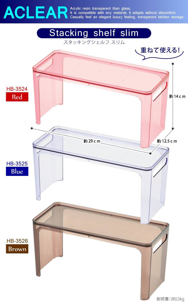 ACLEAR ( アクリア ) スタッキングシェルフ スリム / パール金属 仕様 サイズ:(約)幅29×奥行12.5×高さ14cm 原料樹脂:アクリル樹脂(耐熱温度80度) 耐荷重:(約)3kg(1個使用時) カラバリ:レッド(HB-3524)、ブルー(HB-3525)、ブラウン (HB-3526) 原産国:日本 ※WEB上のため、実物と画像とで色など、多少違う点がございますのでご理解ください。