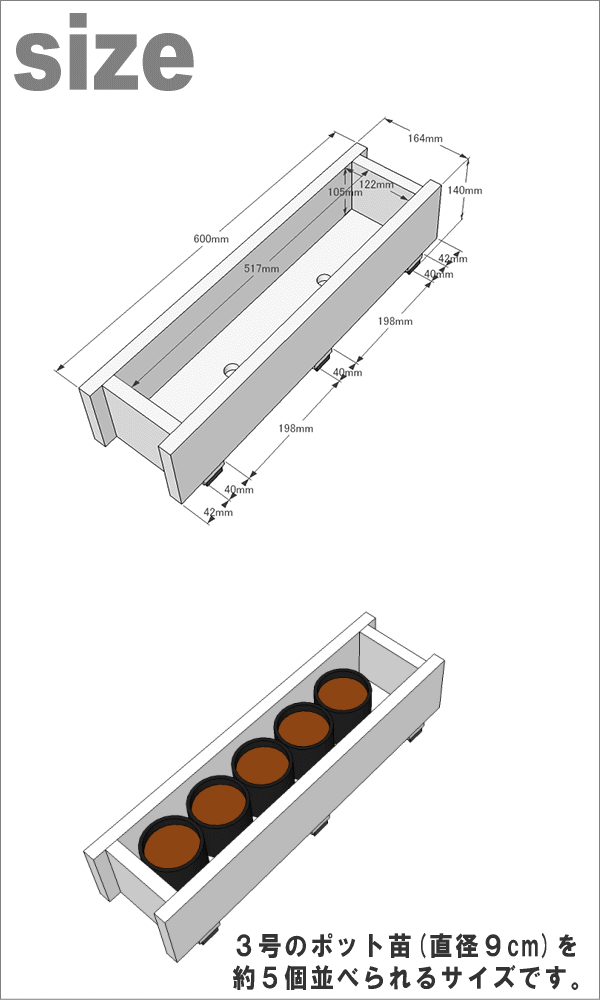素材・生産国産杉(宮崎産)>>樹種について本社広島県廿日市市の自社工場で一つ一つ手作りで生産SPEC 外寸: 幅600×奥行164×高さ140mm 容量: 6.5L 重さ: 1.8kg 底板: 水抜き穴2個、取り外し可 色・塗装>>色見本請求はこちら(無料サービス)組み立て組み立て不要の完成品※商品到着時、底板が本体から外れている場合は、底板を本体にセットしてください。