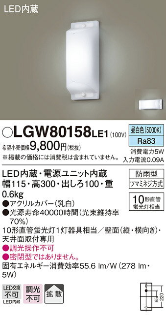 商 品 詳 細商品名パナソニック エクステリアライトメーカー名パナソニック Panasonicメーカー器具名称エクステリアライト ブラケットライト ポーチライト光源◆LED(昼白色タイプ) ◆ランプ色温度:5000 K ◆光源寿命40000時間(光束維持率70%)寸法・質量◆幅:115 mm ◆高:300 mm ◆出しろ:100 mm ◆質量:0.6 kg仕様◆全光束:278 lm ◆電圧:100 V ◆消費電力:5 W ◆消費効率:55.6 lm/W ◆デザイン分類:Stylish Modern Casual ◆【アクリルカバー】乳白 ◆Ra83 ◆10形直管蛍光灯1灯器具相当 ◆壁面(縦・横向き)・天井面取付専用 ◆入力電流(100V時):0.09 A ◆調光操作不可 ◆密閉型ではありません。