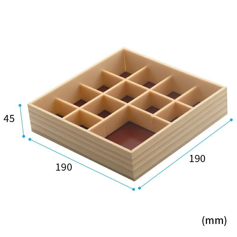 商品詳細商品名折箱 桐190角45 蓋共13マス仕切付[ケース132入]サイズ190×190×45mm入数132色柄桐単価(税抜き)230.00円材質[本体・仕切]PSP、[底]紙、[蓋]PSP 商品説明高級感と重厚感を兼ね備えた使い捨て弁当箱です。